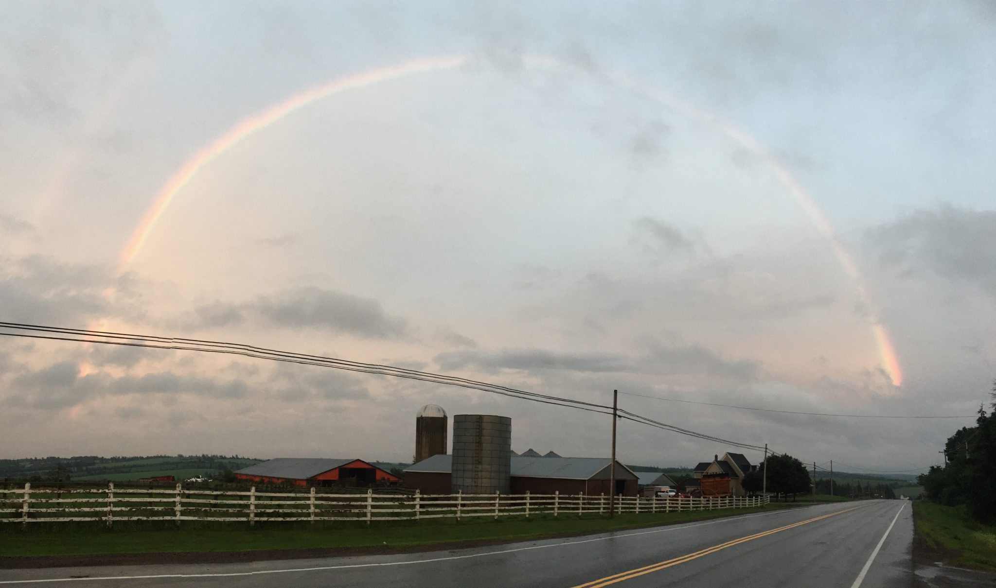 Saturday was a mixed bag of weather, with rain off and on during the afternoon, but this didn’t dampen the mood. Concert-goers got soaked, dried off, then soaked again, but it cleared shortly before Carrie Underwood took the stage around 9 pm. I wasn’t at the concert, but headed back from Charlottetown with my son, and happened to catch the most beautiful rainbow along the way. I stopped for a photo, but my pictures don’t do it justice.
