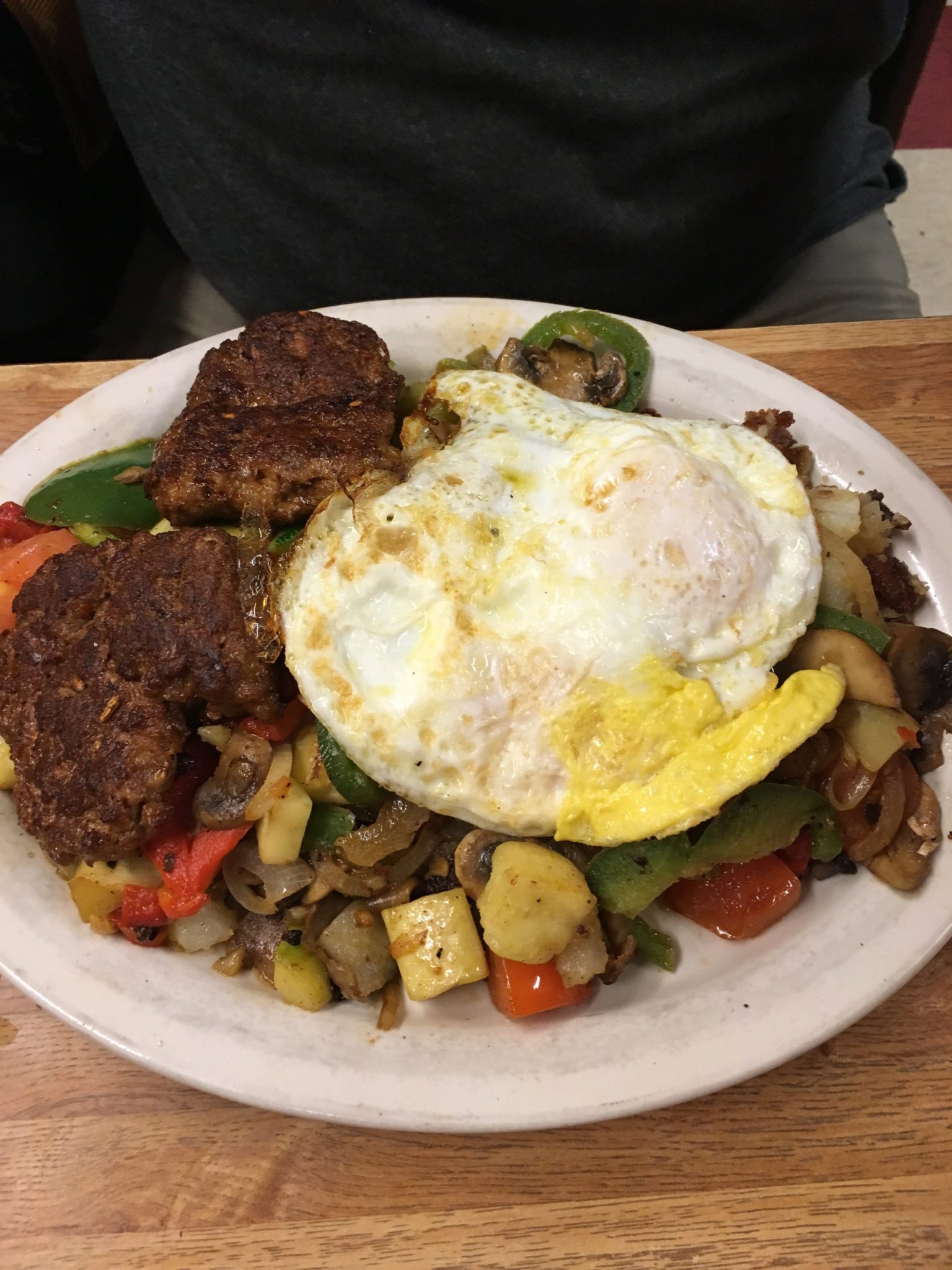 My husband went with Deluca’s Mixed Grill, a loaded plate with your choice of meat, eggs, and grilled veggies (zucchini, onions, mushrooms, tomatoes, green and red peppers), home fries and toast.