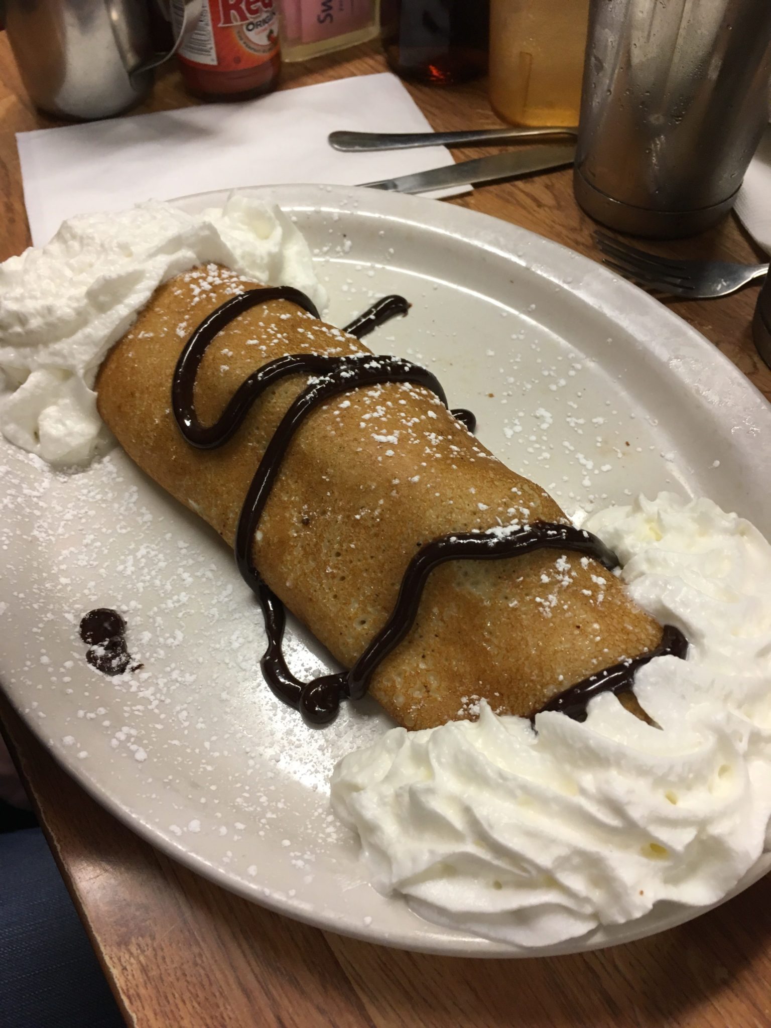 My son had a plate sized pancake, my daughter went with a Chocolate Strawberry crepe topped with hot fudge, whipped cream and a powdered sugar dusting, and a milkshake.